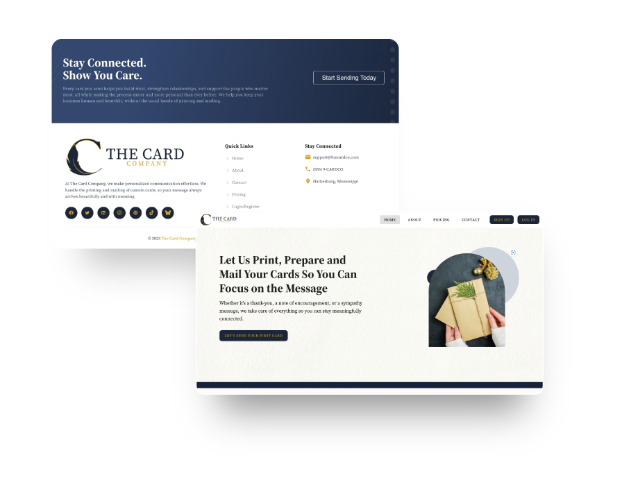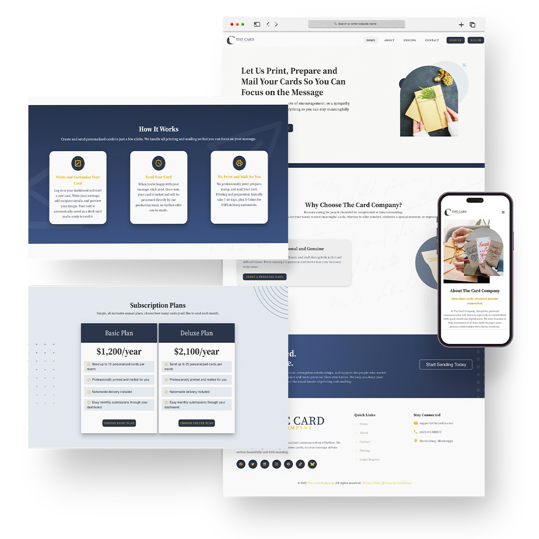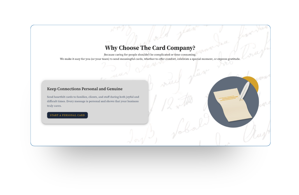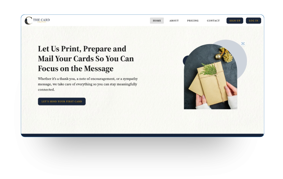 Because The Card Company had no brand, we created everything from the ground up. Our design team produced the logo, color palette, and typography, establishing a consistent visual identity that feels warm, trustworthy, and professional. The brand was designed to appeal to both business users and individuals looking for personal connection.